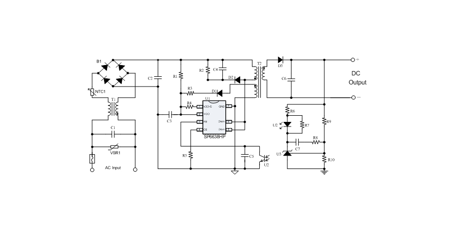 SP6638HP是一顆電流模式PWM控制芯片,內(nèi)置功率MOSFET,用于功率在27W以內(nèi)的方案。該芯片在系統(tǒng)輸出空載時(shí)工作在跳頻模式,在系統(tǒng)輸出輕載到中等負(fù)載階段工作在PFM模式,在輸出重載時(shí)工作在最大恒定工作頻率。SP6638HP的啟動(dòng)電流和工作電流設(shè)定的比較小,以此減小待機(jī)時(shí)的功耗。芯片內(nèi)置有斜坡補(bǔ)償電路,避免次諧波振蕩的發(fā)生,改善系統(tǒng)的穩(wěn)定性。芯片內(nèi)置有前沿消隱時(shí)間(Leading-edge blanking time),消除緩沖網(wǎng)絡(luò)中的二極管反向恢復(fù)電流對(duì)電路的影響。該芯片帶有抖頻功能,能夠有效改善系統(tǒng)的EMI性能。芯片最低的工作頻率設(shè)置在音頻以上,在工作時(shí)可以避免系統(tǒng)產(chǎn)生噪音。SP6638HP內(nèi)置多種保護(hù),包括逐周期限流保護(hù)(OCP),過(guò)壓保護(hù)(OVP),VDD過(guò)壓箝位,欠壓保護(hù)(UVLO),過(guò)溫保護(hù)(OTP)等,通過(guò)內(nèi)部的圖騰柱驅(qū)動(dòng)結(jié)構(gòu)可以更好的改善系統(tǒng)的EMI特性和開(kāi)關(guān)的軟啟動(dòng)控制。SP6638HP使用DIP7無(wú)鉛封裝。