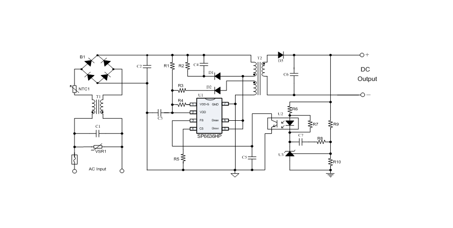 SP6636HP是一顆電流模式PWM控制芯片,內(nèi)置功率MOSFET,用于功率在12W以內(nèi)的方案。該芯片在系統(tǒng)輸出空載時(shí)工作在跳頻模式,在系統(tǒng)輸出輕載到中等負(fù)載階段工作在PFM模式,在輸出重載時(shí)工作在最大恒定工作頻率。SP6636HP的啟動(dòng)電流和工作電流設(shè)定的比較小,以此減小待機(jī)時(shí)的功耗。芯片內(nèi)置有斜坡補(bǔ)償電路,避免次諧波振蕩的發(fā)生,改善系統(tǒng)的穩(wěn)定性。芯片內(nèi)置有前沿消隱時(shí)間(Leading-edge blanking time),消除緩沖網(wǎng)絡(luò)中的二極管反向恢復(fù)電流對(duì)電路的影響。該芯片帶有抖頻功能,能夠有效改善系統(tǒng)的EMI性能。芯片最低的工作頻率設(shè)置在音頻以上,在工作時(shí)可以避免系統(tǒng)產(chǎn)生噪音。SP6636HP內(nèi)置多種保護(hù),包括逐周期限流保護(hù)(OCP),過壓保護(hù)(OVP),VDD過壓箝位,欠壓保護(hù)(UVLO),過溫保護(hù)(OTP)等,通過內(nèi)部的圖騰柱驅(qū)動(dòng)結(jié)構(gòu)可以更好的改善系統(tǒng)的EMI特性和開關(guān)的軟啟動(dòng)控制。