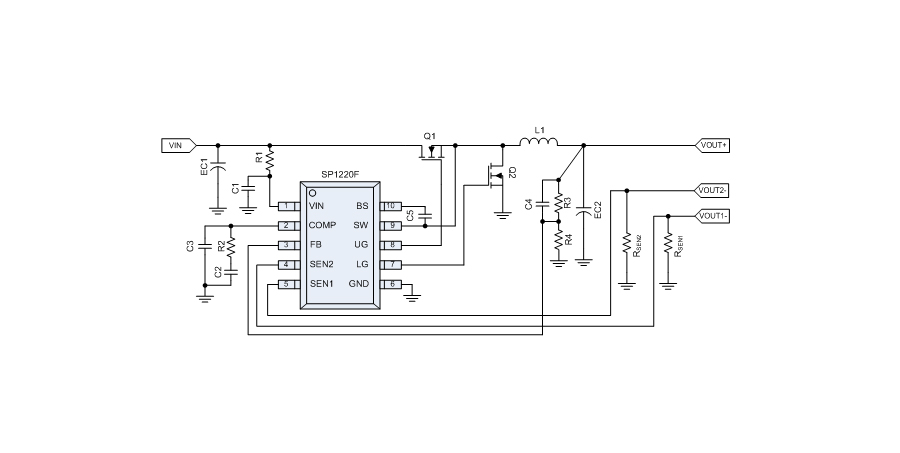 SP1220F是一款同步降壓型PWM控制器,該控制器可驅動雙路輸出8A(4A+4A)負載電流。設計允許SP1220F在9V到40V寬輸入電壓范圍內工作。通過將COMP/EN引腳邏輯電平拉低來實現(xiàn)外部關斷功能,并進入待機模式。外部補償使反饋控制環(huán)路具有良好的線壓調整率和負載調整率,且外圍設計靈活。