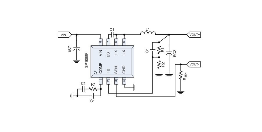 SP1088F是一款同步降壓轉(zhuǎn)換器,該轉(zhuǎn)換器可驅(qū)動輸出2.4A負(fù)載電流。設(shè)計允許SP1088F在9V到40V寬輸入電壓范圍內(nèi)工作。通過將COMP/EN引腳邏輯電平拉低來實(shí)現(xiàn)外部關(guān)斷功能,并進(jìn)入待機(jī)模式。外部補(bǔ)償使反饋控制環(huán)路具有良好的線壓調(diào)整率和負(fù)載調(diào)整率,且外圍設(shè)計靈活。