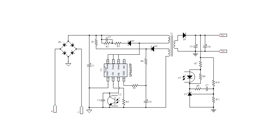 SP6649P內置多種保護,包括逐周期限流保護(OCP),過載保護(OLP),過壓保護(VDD OVP),VDD過壓箝位,欠壓保護(UVLO),過溫保護(OTP)等,通過內部的圖騰柱驅動結構可以更好的改善系統(tǒng)的EMI特性和開關的軟啟動控制。