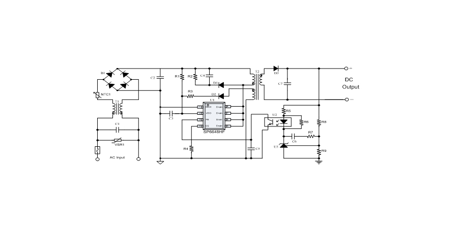 SP6648HF是一顆電流模式PWM控制芯片,內(nèi)置650V高壓功率MOSFET,應(yīng)用于功率在18W以內(nèi)的方案。SP6648HF在PWM模式下工作于固定開(kāi)關(guān)頻率,這個(gè)頻率是由內(nèi)部精確設(shè)定。在空載或者輕載時(shí),工作頻率由IC內(nèi)部調(diào)整。芯片可以工作在綠色模式,以此來(lái)減小輕載時(shí)的損耗,提高整機(jī)的工作效率。SP6648HF在啟動(dòng)和工作時(shí)只需要很小的電流,可以在啟動(dòng)電路中使用一個(gè)很大的電阻,以此來(lái)進(jìn)一步減小待機(jī)時(shí)的功耗。芯片內(nèi)置有斜坡補(bǔ)償電路,當(dāng)電路工作于大占空比時(shí),避免次諧波振蕩的發(fā)生,改善系統(tǒng)的穩(wěn)定性。內(nèi)置有前沿消隱時(shí)(Leading-edge blanking time),消除緩沖網(wǎng)絡(luò)中的二極管反向恢復(fù)電流對(duì)電路的影響。SP6648HF采用了抖頻技術(shù),能夠有效改善系統(tǒng)的EMI性能。系統(tǒng)的跳頻頻率設(shè)置在音頻(22KHz)以上,在工作時(shí)可以避免系統(tǒng)產(chǎn)生噪音。SP6648HF內(nèi)置多種保護(hù),包括逐周期限流保護(hù)(OCP),過(guò)載保護(hù)(OLP),過(guò)壓保護(hù)(VDD OVP),VDD過(guò)壓箝位,欠壓保護(hù)(UVLO),過(guò)溫保護(hù)(OTP)等,通過(guò)內(nèi)部的圖騰柱驅(qū)動(dòng)結(jié)構(gòu)可以更好的改善系統(tǒng)的EMI特性和開(kāi)關(guān)的軟啟動(dòng)控制。
