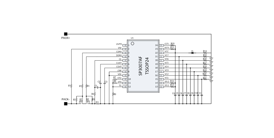 SP3007AF是一款用于6-7串鋰電池的保護(hù)芯片,SP3007AF 內(nèi)部集成了高精度的電壓、電流檢測電路,能夠?qū)崿F(xiàn)每串電池的過壓、欠壓保護(hù),以及整串電池的充電過流、放電過流、短路保護(hù)和充放電的溫度保護(hù)等。SP3007AF 內(nèi)部集成 N型 MOSFET 的驅(qū)動電路,能夠直接驅(qū)動外部 N 型充電管和放電管,既可以兼容充放電分口應(yīng)用,也可以兼容充放電同口應(yīng)用。