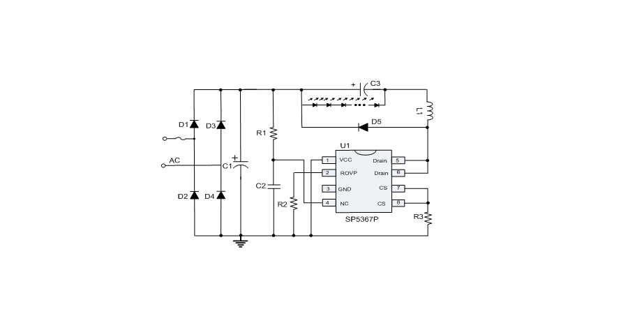 SP5367P內(nèi)部集成了一個(gè)500V高壓功率開關(guān)管,而且芯片的工作電流極低,降低了系統(tǒng)損耗,提高了效率。無需輔助繞組供電,減少了外圍元件的使用。采用了新型的電流檢測(cè)方式和驅(qū)動(dòng),即使在成本和體積都縮減的情況下也可實(shí)現(xiàn)優(yōu)異的恒流特性。SP5367P內(nèi)置高精度的電流采樣電路和特殊的恒流控制技術(shù),實(shí)現(xiàn)高精度的恒流輸出。芯片工作在電感電流臨界連續(xù)模式,輸出電流不會(huì)隨著電感量和輸出負(fù)載的變化而變化。