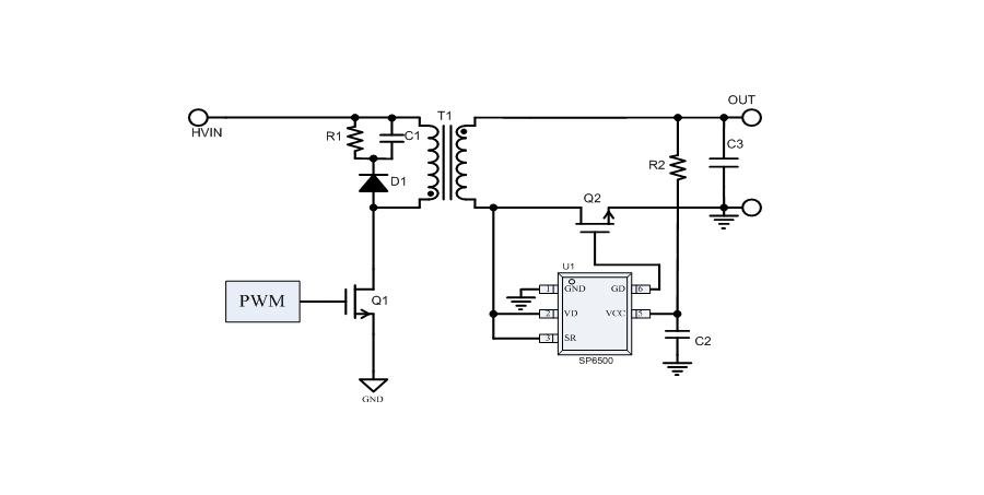 SP6500通過檢測外置MOSFET的漏源電壓,控制MOSFET的導(dǎo)通與截止。應(yīng)用外圍簡單,適用于5~12V輸出的應(yīng)用方案。