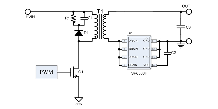 SP6508F檢測內(nèi)置MOSFET的導(dǎo)通電阻(Rds-on)上的壓降,來控制MOSFET的開關(guān)。應(yīng)用外圍簡單