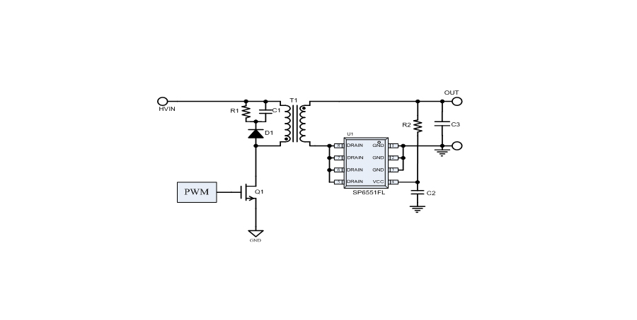 SP6551FL檢測內(nèi)置MOSFET的導(dǎo)通電阻(Rds-on)上的壓降,來控制MOSFET的開關(guān)。應(yīng)用外圍簡單。固定用于5V輸出的應(yīng)用方案。
