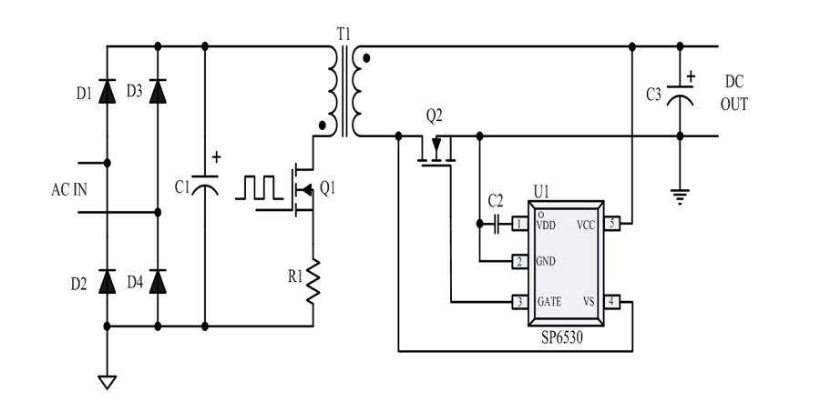 SP6530是一顆高性能的開關(guān)電源次級側(cè)同步整流控制電路。在低壓大電流開關(guān)電源應(yīng)用中,輕松滿足6級能效,是理想的超低導(dǎo)通壓降整流器件的解決方案。芯片可支持高達(dá)150KHz的開關(guān)頻率應(yīng)用,并且支持CCM / QR / DCM等開關(guān)電源工作模式應(yīng)用,其極低導(dǎo)通壓降產(chǎn)生的損耗遠(yuǎn)小于肖特基二極管的導(dǎo)通損耗,極大提高了系統(tǒng)的轉(zhuǎn)換效率,大幅降低了整流器件的溫度。高達(dá)1A的峰值電流驅(qū)動能力可確保快速開通和關(guān)斷外部的大電流MOSFET器件,獲得優(yōu)異的轉(zhuǎn)換效能,輸出電壓鉗位功能使得高供電電壓下柵極仍然安全可靠。