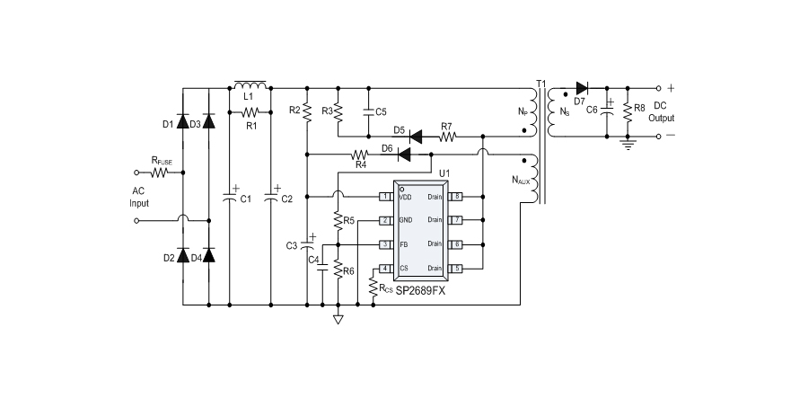SP2689FB提供全面的保護功能,包括逐周期限流保護(OCP)、VDD過壓保護(OVP)、VDD欠壓保護(UVLO)、FB過壓保護、輸出短路保護、輸出過壓保護、過溫保護等。其中,輸出短路保護、輸出過壓保護具有自動重啟恢復(fù)的功能。