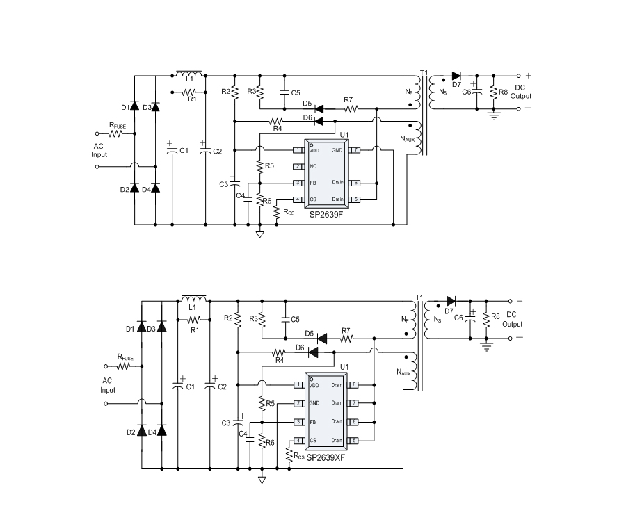 SP2639AF提供全面的保護功能,包括逐周期限流保護(OCP)、VDD過壓保護(OVP)、VDD欠壓保護(UVLO)、FB過壓保護、輸出短路保護、輸出過壓保護、過溫保護等。其中,輸出短路保護、輸出過壓保護具有自動重啟恢復的功能。