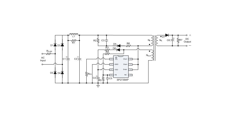 SP2739AP提供全面的保護功能,包括逐周期限流保護(OCP)、VDD過壓保護(OVP)、VDD欠壓保護(UVLO)、VDD鉗位、FB開/短路保護、輸出短路保護、輸出過壓保護、過溫保護等。